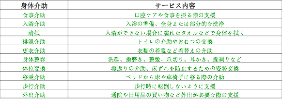 食事、洗面、入浴、部分浴(洗髪、陰部・足部などのみの洗浄)、清拭(せいしき:身体を拭いて清潔にすること)、洗髪、排泄、衣類の着脱、床ずれの予防、体位変換・姿勢交換、ベッドメイキング、歩行、車いす等にかかわる介助。
