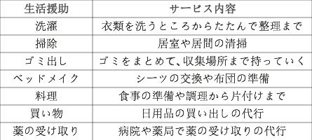 買物、調理、配膳、洗濯、掃除、衣類の整理、薬の受け取り等にかかわる介助。